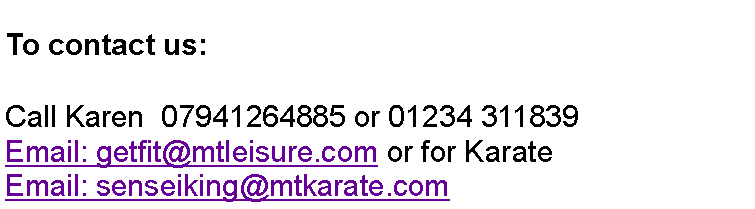 Me-time is a period of time when you can do something that you enjoy to help you relax. Whether it is a karate lesson, fitness class or a personal training session, we aim to help you de-stress, relax and achieve your personal health and fitness goals. We practise Shotokan Karate which is suitable for all the family; children can start from the age of 4 years-old upwards. We have many families that train with us and we offer discounts depending on the number of people. We have beginners’ classes in Putnoe, Brickhill and Lidlington The yoga class is held at Clapham, on Thursday mornings. We practise Hatha Yoga to help stretch and tone the body. The session is completed with a soothing relaxation exercise. The Keep Fit session is a combination of low-impact aerobics, body toning, stretching and relaxation. Pilates aims to improve posture, tone the abdominal muscles, reduce pressure on the back and give a balanced workout. Click on any of the left options for more information |